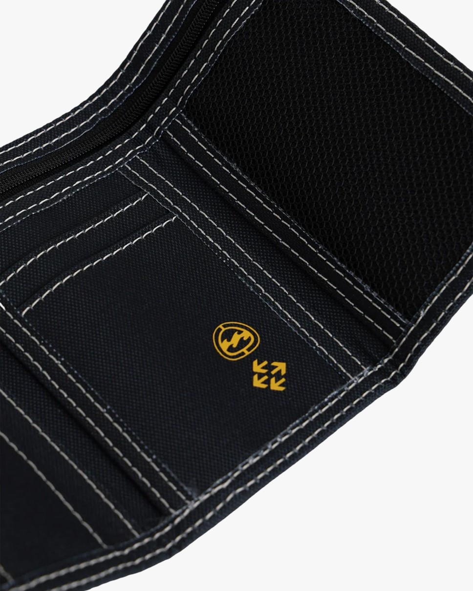 Atom Wallet — A sleek bi-fold wallet designed for every lifestyle. Features a zip coin pocket, multiple card slots, and a notes compartment. Made from recycled fabric with stylish graphic details for a modern touch.